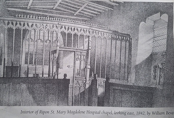 The hospital of St Mary Magdalen was probably built in the 1130s on land given by Thurstan, Archbishop of York 1119-1140, and is the oldest building in Ripon It was founded to care for lepers, travellers and the local destitute. It formed a small community with the stone hospital, assorted wath and plaster buildings all surrounded by a fence with a high gateway to allow haycarts through. There were farm buildings, the master's house, a house for the priests, a dovecote, service buildings such as kitchen, buttery and brewhouse, and possibly an infirmary.