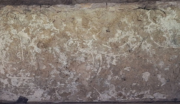 Altars had a cross at each corner and one in the middle. Here the break in the altar has run through the middle cross so only one arm can be seen.